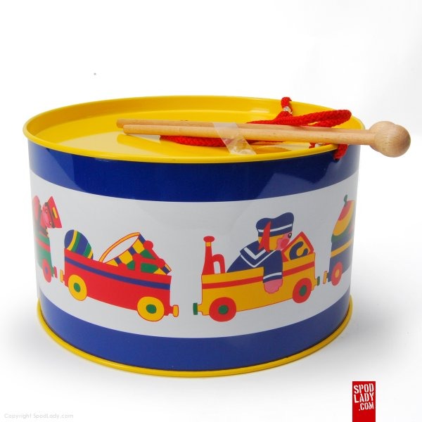 Klasyczny blaszany bębenek z pałeczkami. Robi wiele hałasu. Każdemu maluchowi przyniesie wiele radości, dorosłym... niekoniecznie.