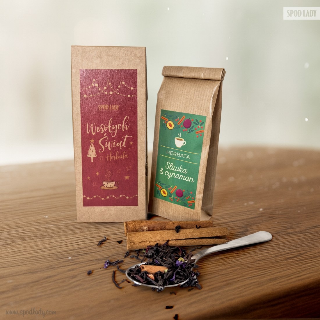 • herbata udekorowana świąteczną owijką z nadrukiem "Wesołych świąt".