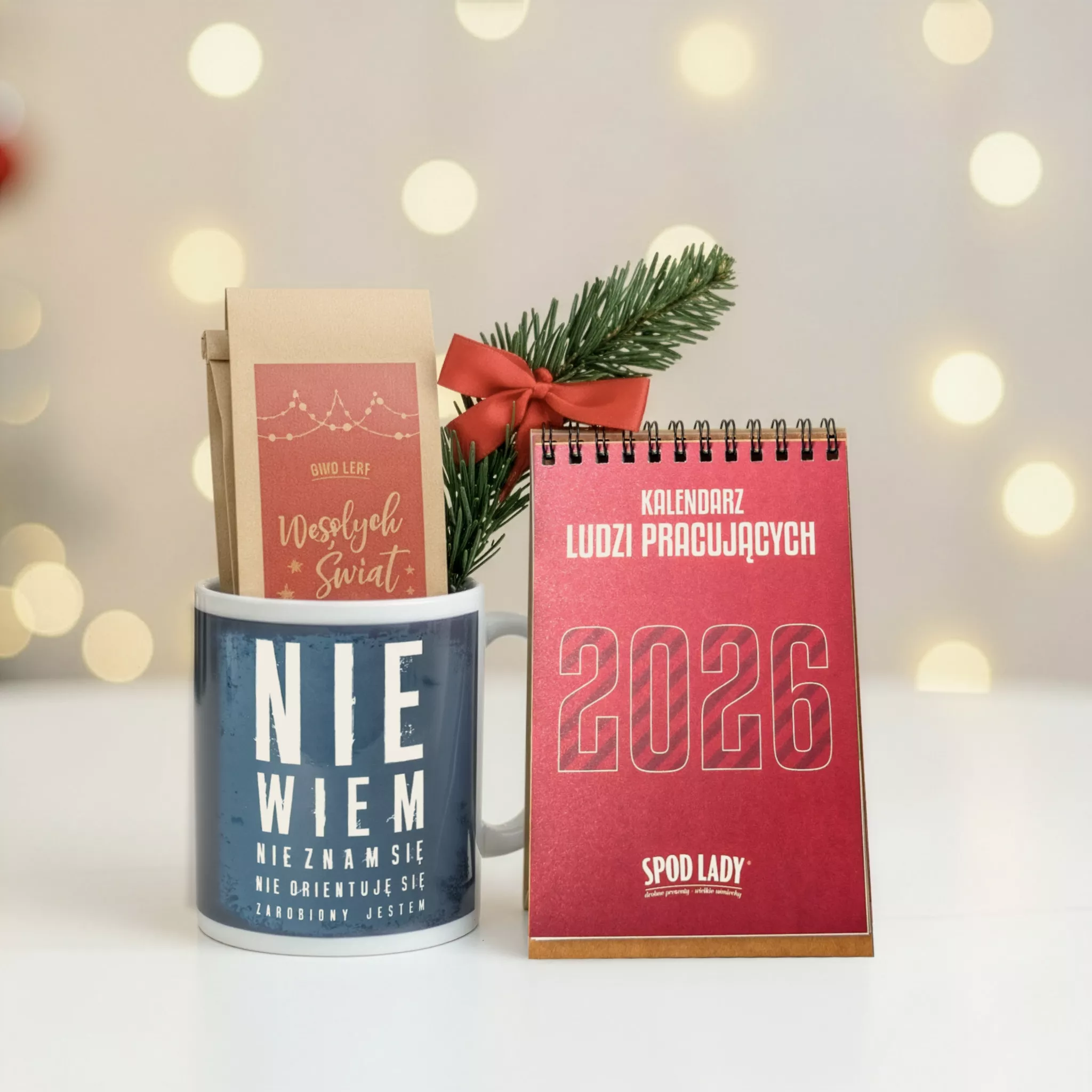 Zestaw "Ludzi pracy" to doskonały prezent dla pracownika, kolegi z pracy, czy znajomej z kalendarzem na 2026 rok, kubkiem i herbatką. Dostępny jest w trzech wersjach do wyboru: