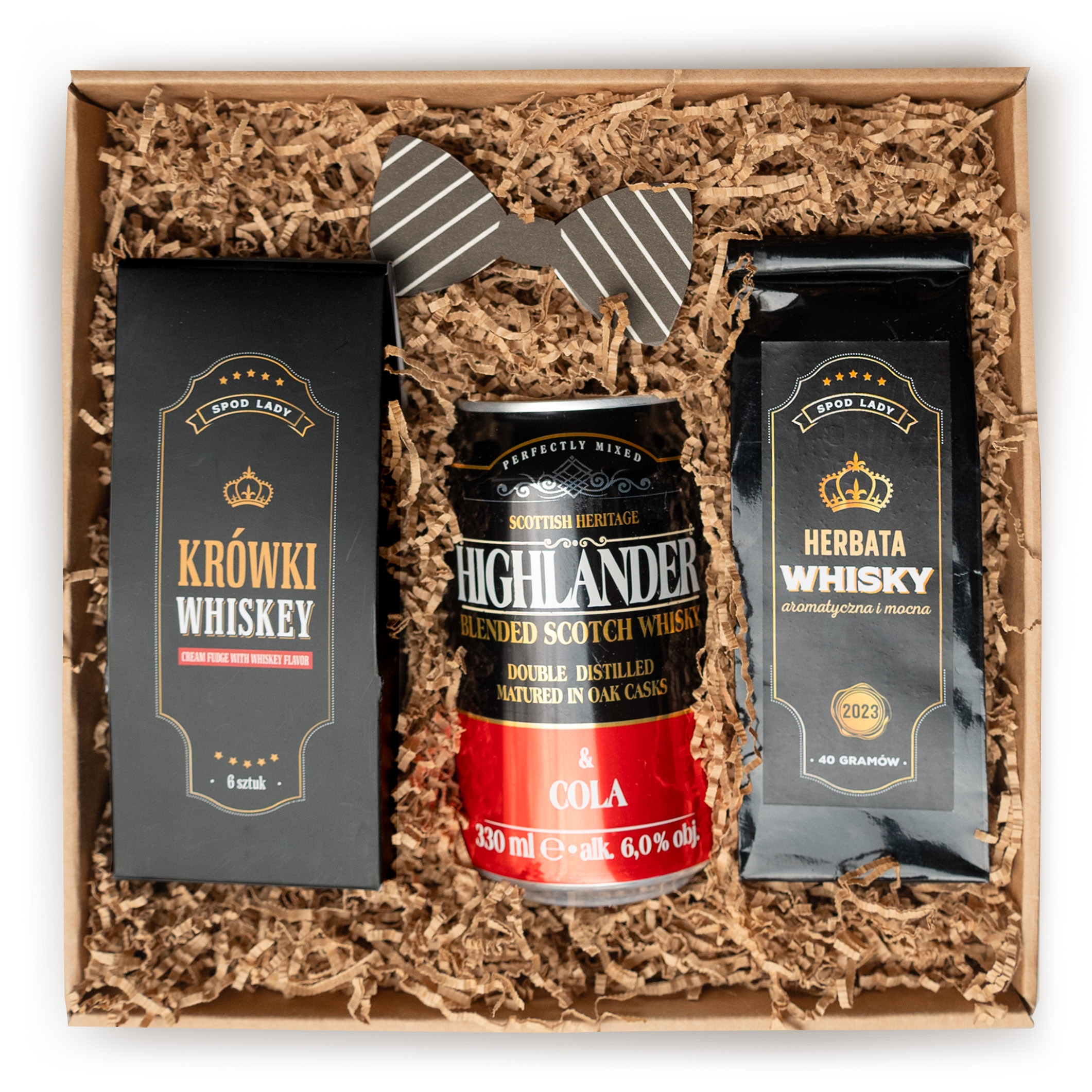 Zestaw Szkocka & Cola to prawdziwa uczta dla miłośników unikalnych doznań. Najważniejszym puntem kraftowego kartonika jest drink w puszce Highlander Whisky & Cola lub Jack Daniels z colą (do wyboru). Obok niego znajduje się zestaw krówek o intensywnym smaku whisky, wykonanych z najwyższej jakości składników. Aby podkreślić męski klimat, dołączyliśmy herbatę o aromacie whisky.