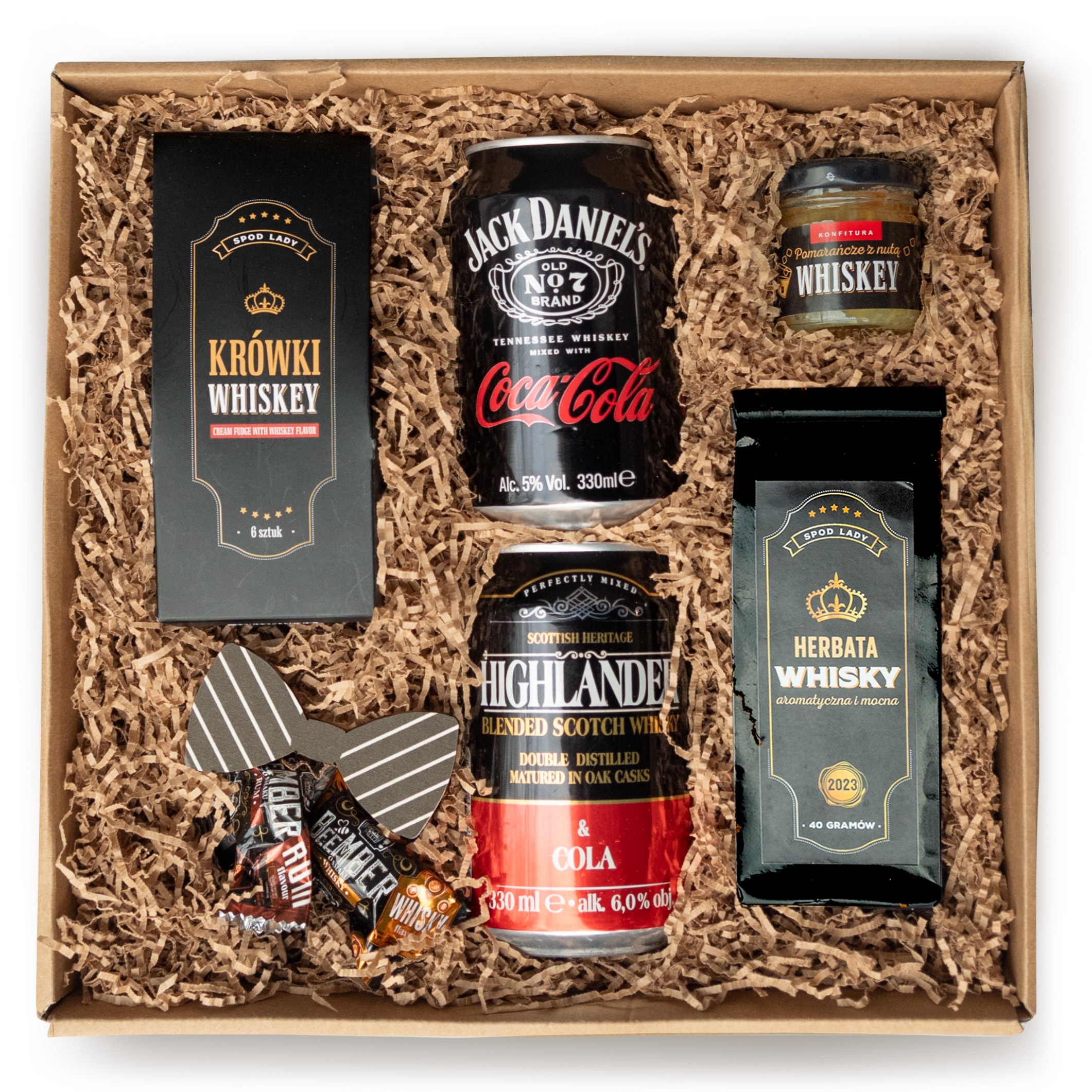 Oto niezwykły zestaw, który łączy w sobie szkocką tradycję i amerykańską whiskey. Bezpretensjonalny, a jednocześnie pełen smaku i stylu. Nadają go drinki - Jack Daniel’s oraz Highlander Whisky (wersja chwilowo niedostępna) z dodatkiem coli. Sąsiadują z nimi herbata, saszetka aromatycznych krówek, słoiczek konfitury lub miodku i cukierki kawowe - Coffee Amo.