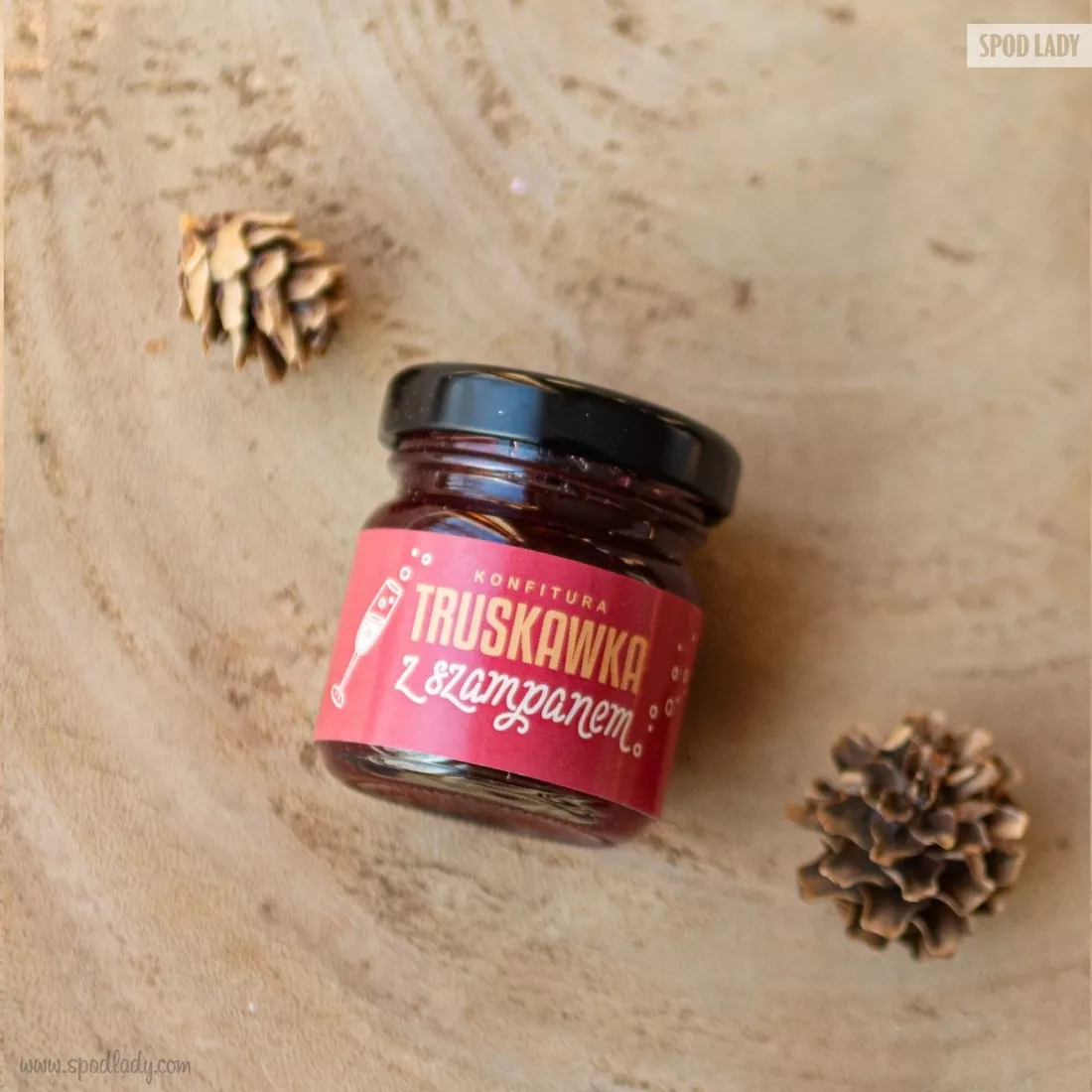 Konfitura truskawkowa z szampanem. Składniki: truskawka 53%, cukier,  wino musujące  do 0,5%, substancja zagęszczająca - pektyna, regulator kwasowości - kwas cytrynowy.
