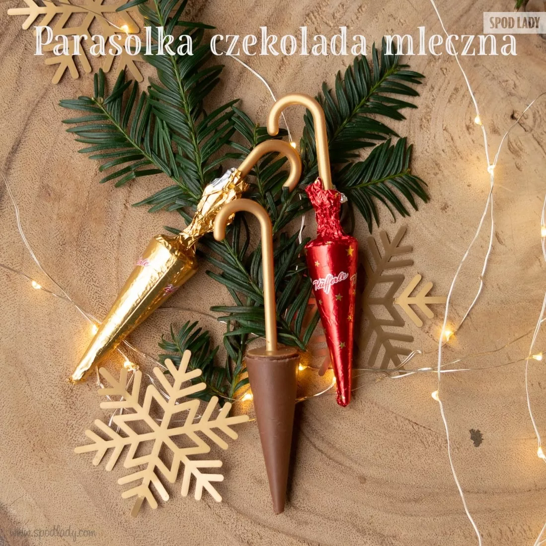 • Parasolka czekoladowa w złotym papierku firmy Kufferle: delikatna, czekoladowa przyjemność otulona złotym blaskiem.