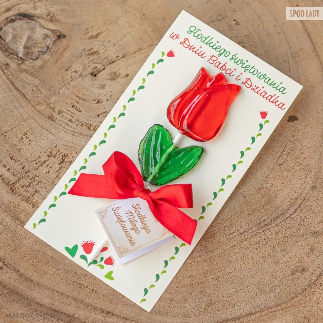 • Lizak w kształcie tulipana: urocza słodycz umieszczona na kartonowej podkładce z wydrukowanymi życzeniami "Słodkiego Świętowania w Dniu Babci i Dziadka".