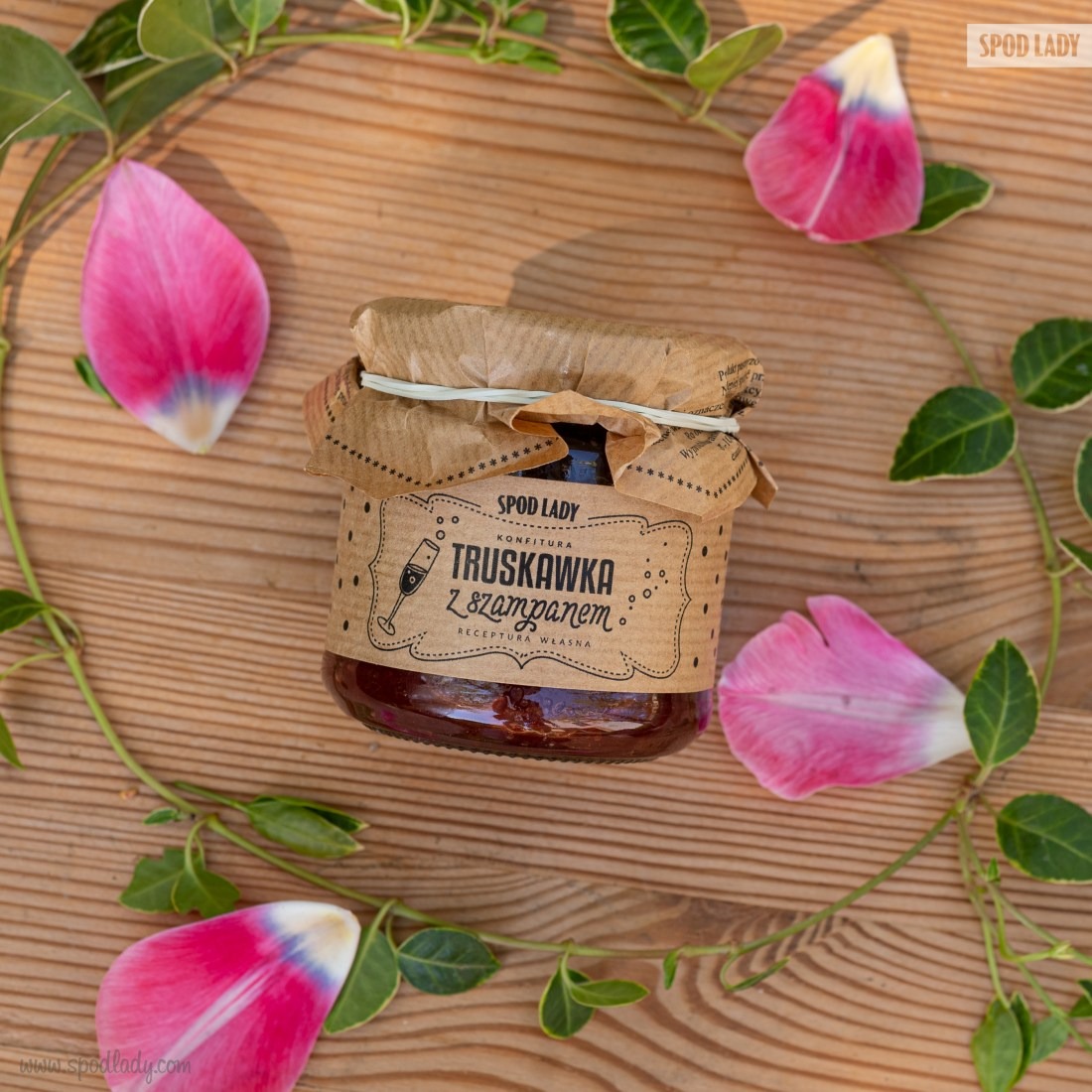 • Konfitura o smaku truskawka - szampan: zachwyca subtelnym smakiem i naturalnym aromatem. Przygotowana tradycyjnymi metodami, bez sztucznych dodatków, stanowi doskonały wybór dla miłośników naturalnych produktów (zamiast konfitury z płatków róży z głównego zdjęcia).