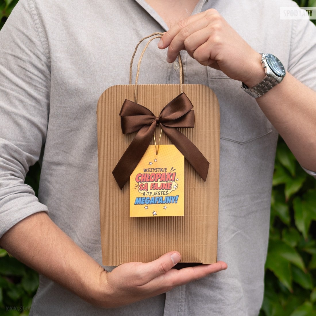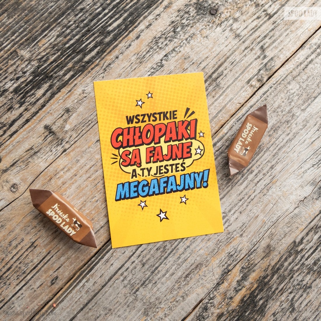 • Pocztówka – Kartka z napisem „Wszystkie chłopaki są fajne, a Ty jesteś megafajny”. Humorystyczny i serdeczny akcent prezentu, na którego odwrocie możesz odręcznie wpisać własne życzenia.