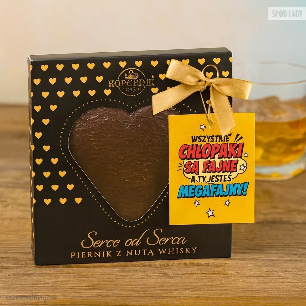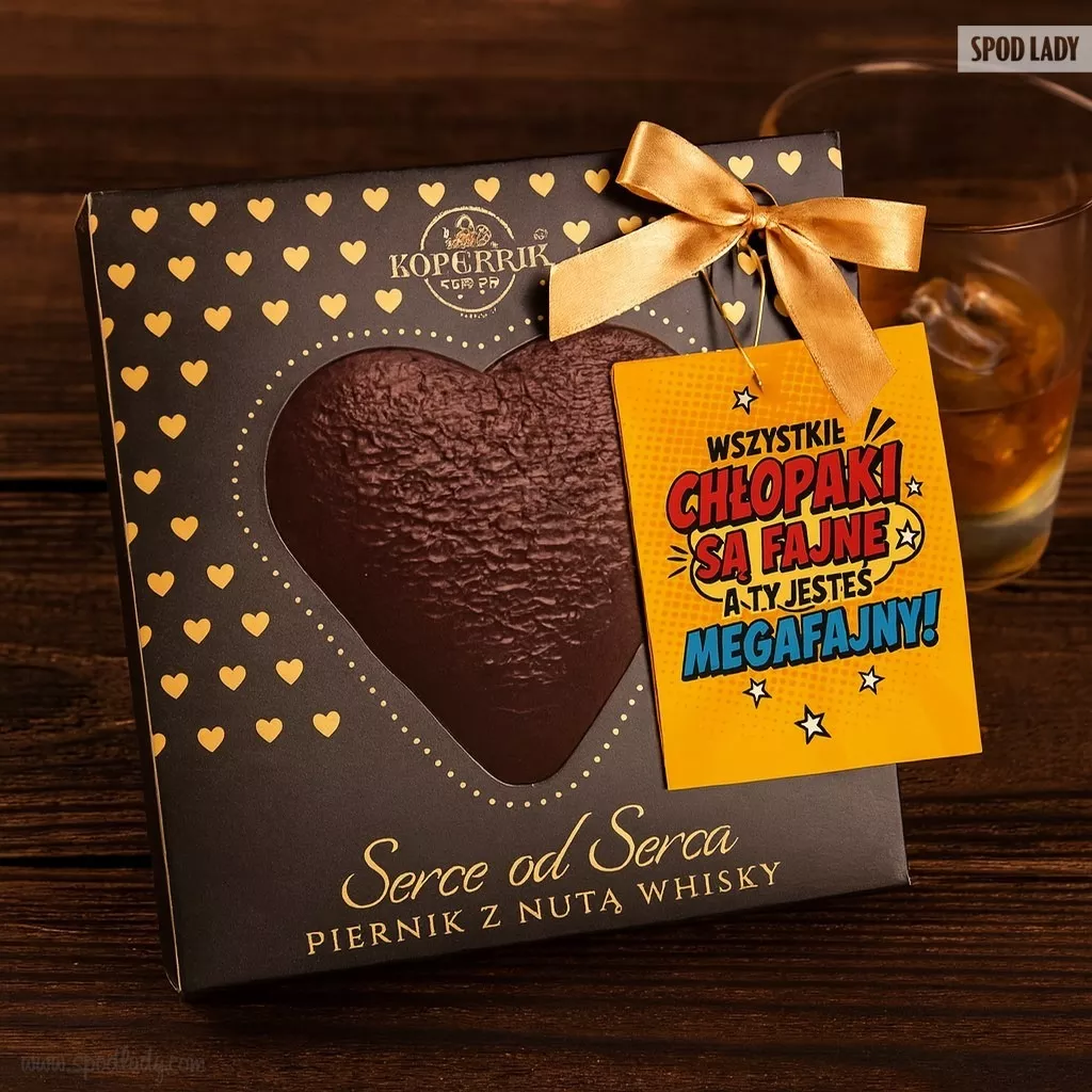 Piernikowe serce w deserowej czekoladzie z nutą whisky to wyjątkowy smakołyk dla miłośników wyrazistych smaków. Aromatyczne, leżakowane ciasto z korzennymi przyprawami tworzy niepowtarzalną kompozycję, zapakowaną w eleganckie pudełko. Zawieszka z napisem „Wszystkie chłopaki są fajne, a Ty jesteś megafajny” nadaje całości lekko humorystyczny i ciepły charakter, czyniąc z niego gotowy prezent na Dzień Chłopaka lub bez okazji.