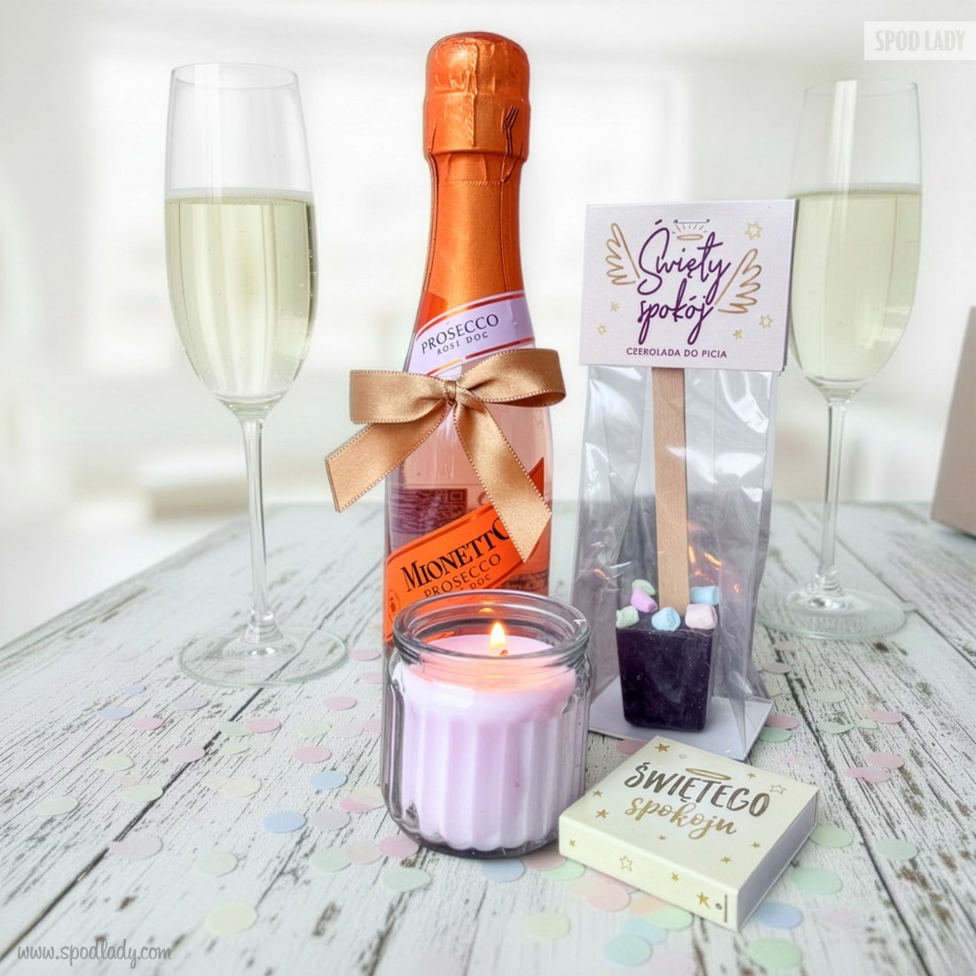 zestaw prezentowy z alkoholem, zestaw z prosecco, prosecco na prezent, upominki firmowe na święta, zestaw świąteczny, prezent bożonarodzeniowy, czekolada, świeca zapachowa, wino musujące, pudełko kraft, święta, boże narodzenie, prezent firmowy, gotowy zestaw