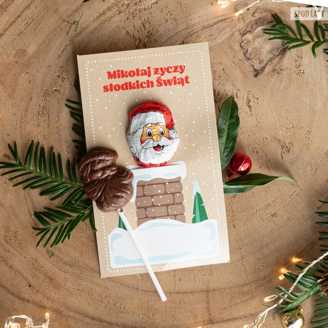 • Mikołajkowy lizak na podkładce: słodki lizak w kształcie głowy Mikołaja to pyszna mleczna czekolada! Zamontowany na naszej autorskiej podkładce z nadrukiem "Mikołaj życzy słodkich Świąt", stanowi uroczy dodatek do naszej paczki.