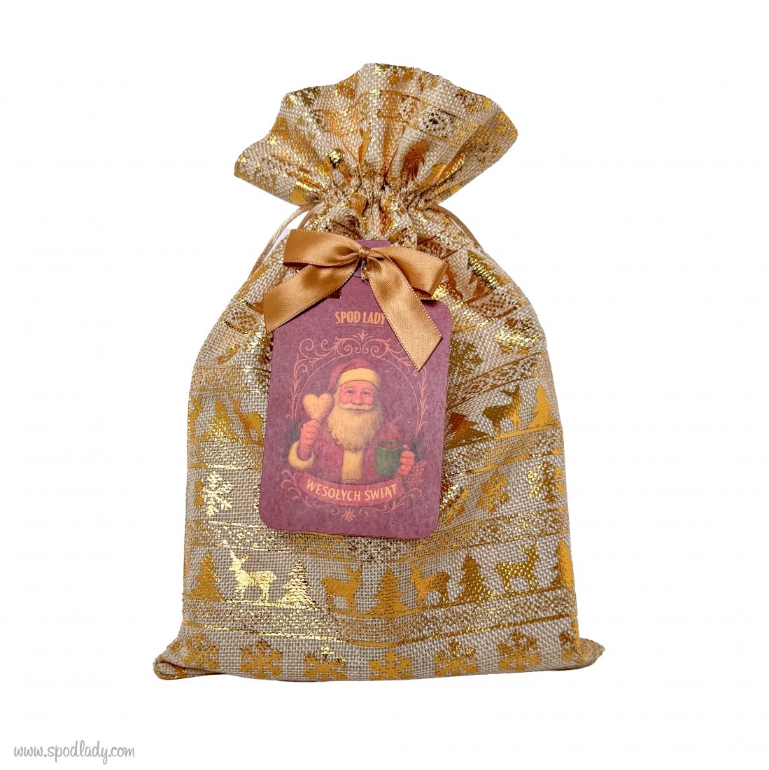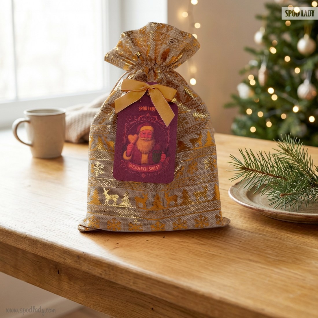 Oto słodki zestaw z piernikiem w złotym woreczku - elegancka oprawa, która zamieni twój upominek w świąteczny skarb gotowy do wręczenia. Łączy tradycję piernikarską ze świątecznym przesłaniem.