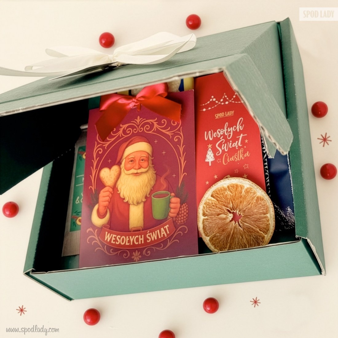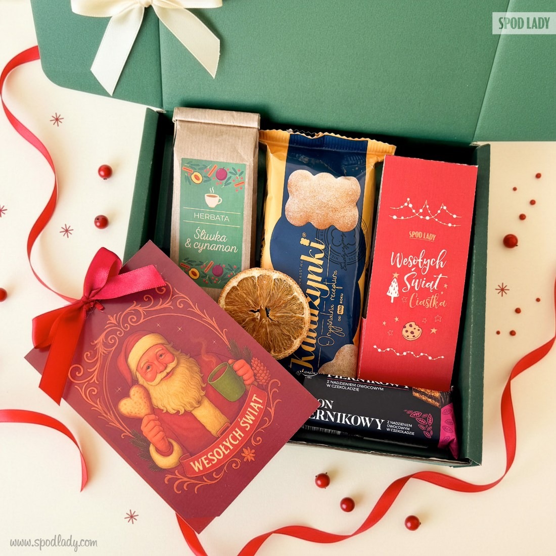 Tradycyjny zestaw świąteczny ze słodkimi łakociami w roli głównej. Całość zamknięta w zielony, ozdobny kartonik.