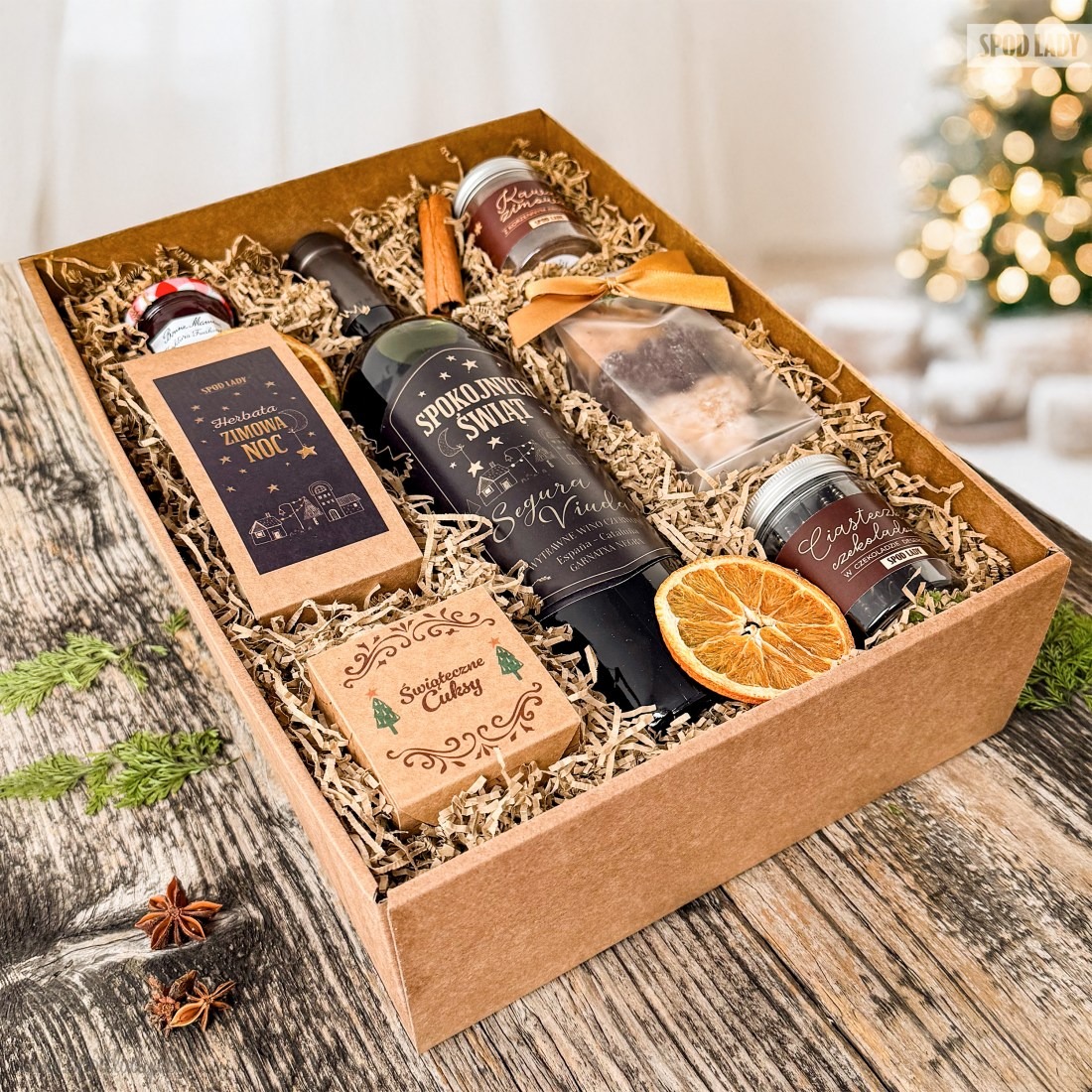 zestaw prezentowy z winem, zestaw z alkoholem, wino na prezent, upominki firmowe na święta, zestaw świąteczny, prezent bożonarodzeniowy, pudełko kraft, święta, boże narodzenie, prezent firmowy, gotowy zestaw