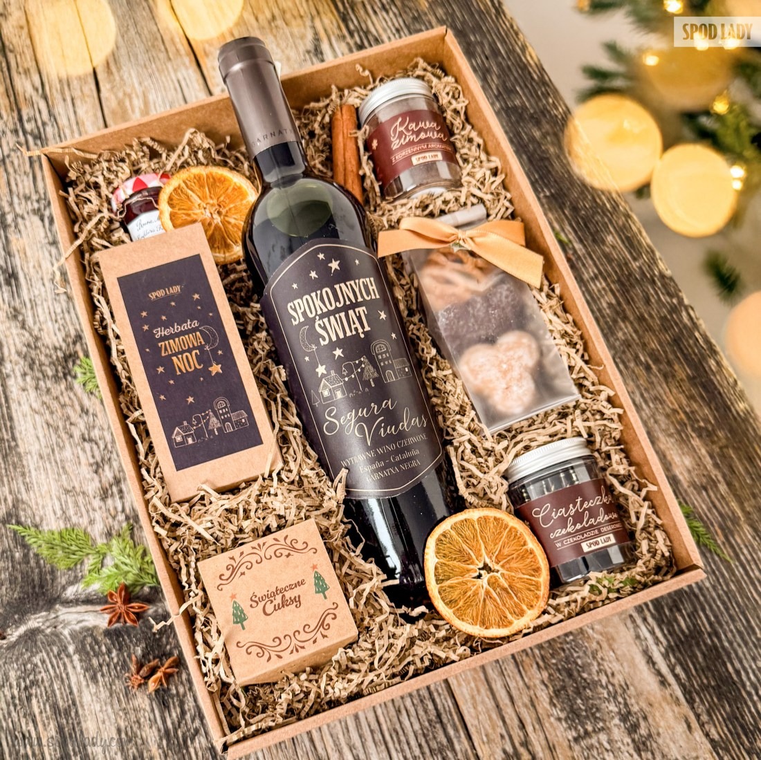 • Czerwone wino z etykietą "Spokojnych świąt": wytrawne czerwone wino klasy premium, pochodzące od uznanych włoskich lub hiszpańskich winiarzy, słynących z dbałości o smak i tradycję.