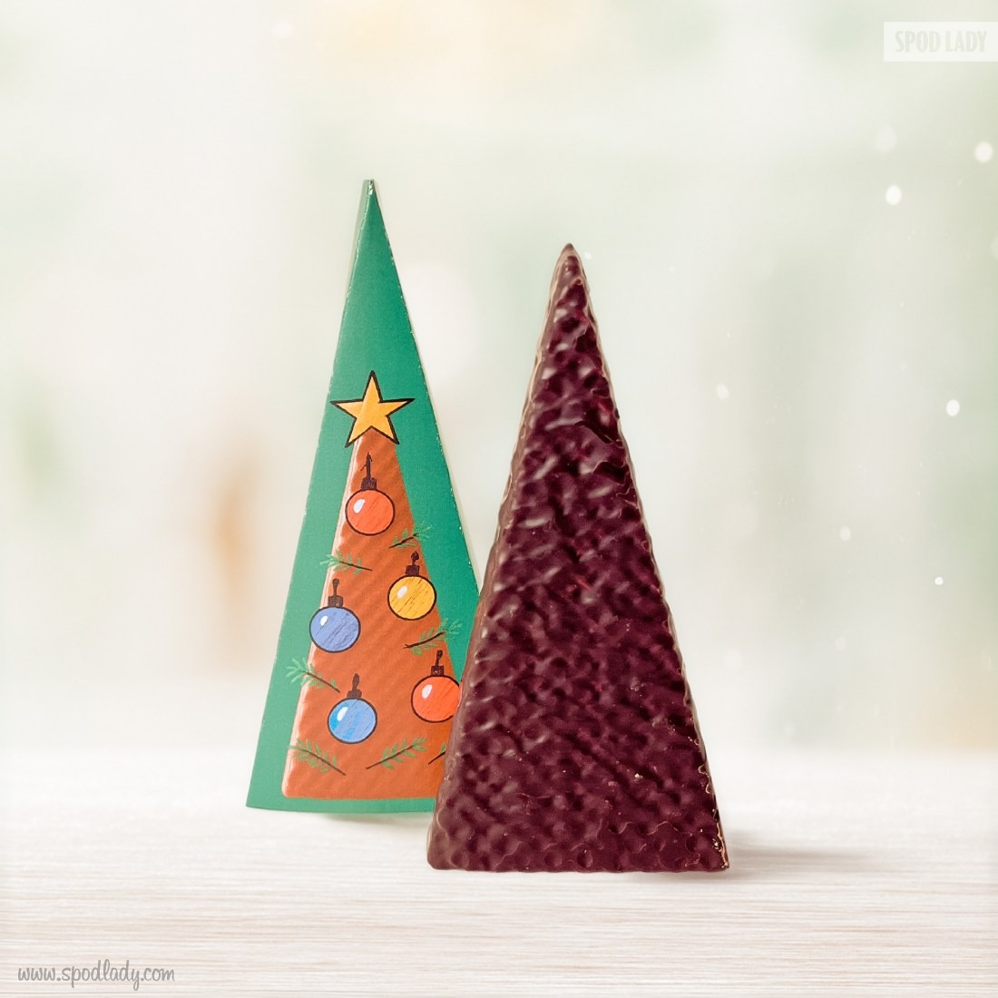 • Wafelki Estelise w czekoladzie – 2 szt. – trójkątne wafelki w kształcie choinki, z kremowym nadzieniem kakaowym, oblane mleczną czekoladą; każdy zapakowany w osobny kartonik z kolorową, świąteczną grafiką, wygodny jako mała słodycz do kawy lub dodatek do prezentu.