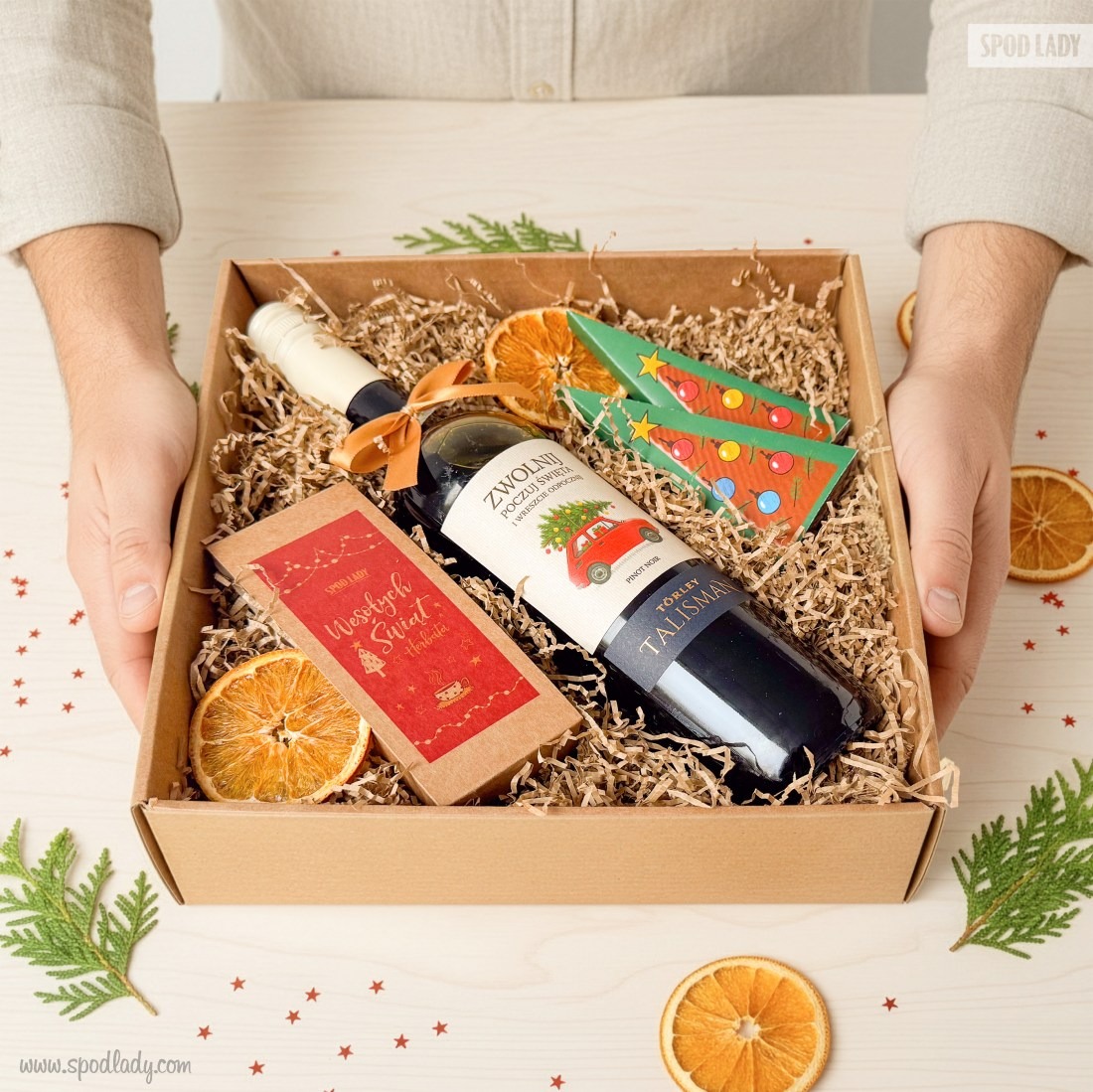 Zestaw zawiera wytrawne wino Pinot Noir, herbatę śliwka–cynamon w kraftowym opakowaniu oraz dwa trójkątne wafle Estelise w świątecznych kartonikach. Kompozycja utrzymana jest w sezonowej estetyce i przygotowana do wręczenia jako prezent
