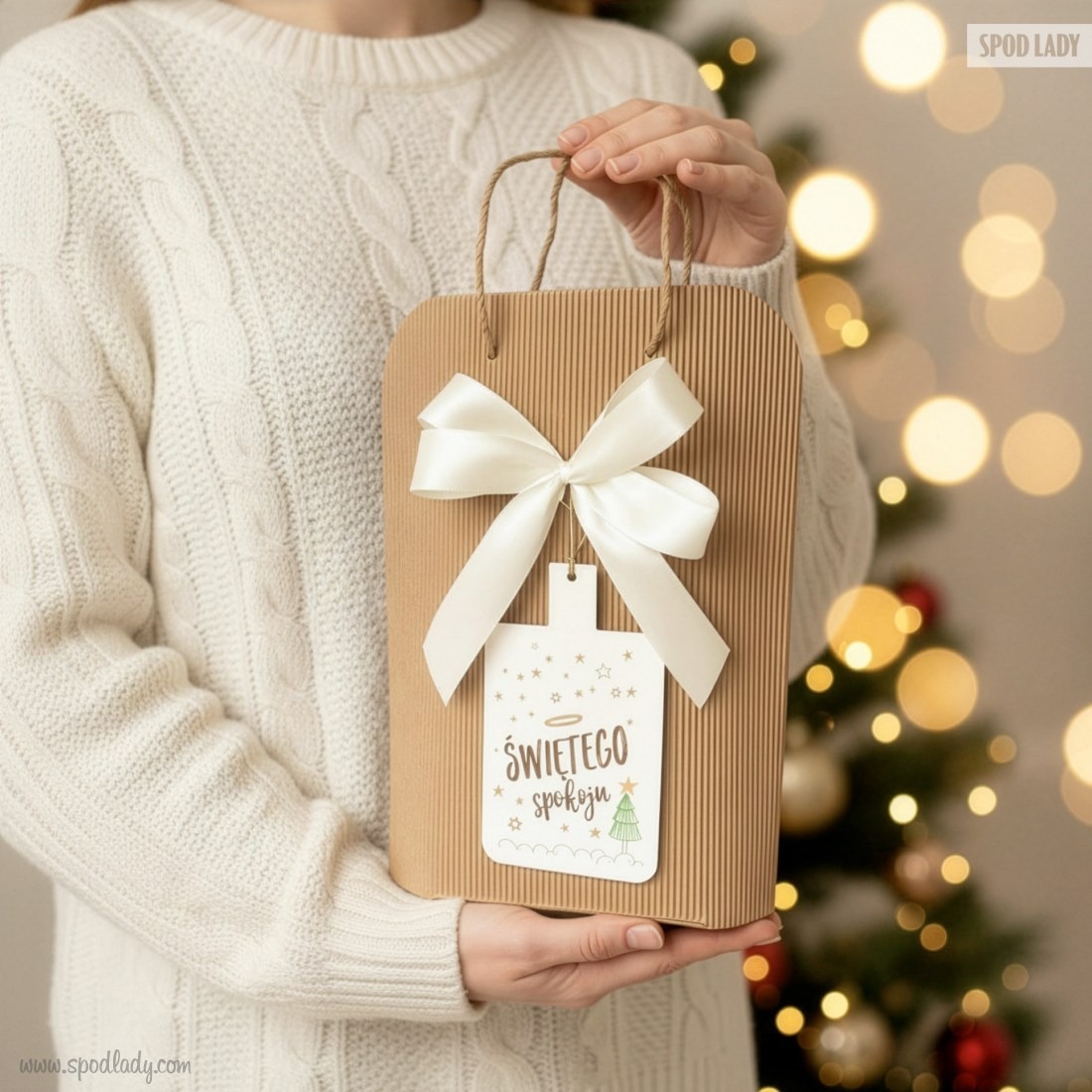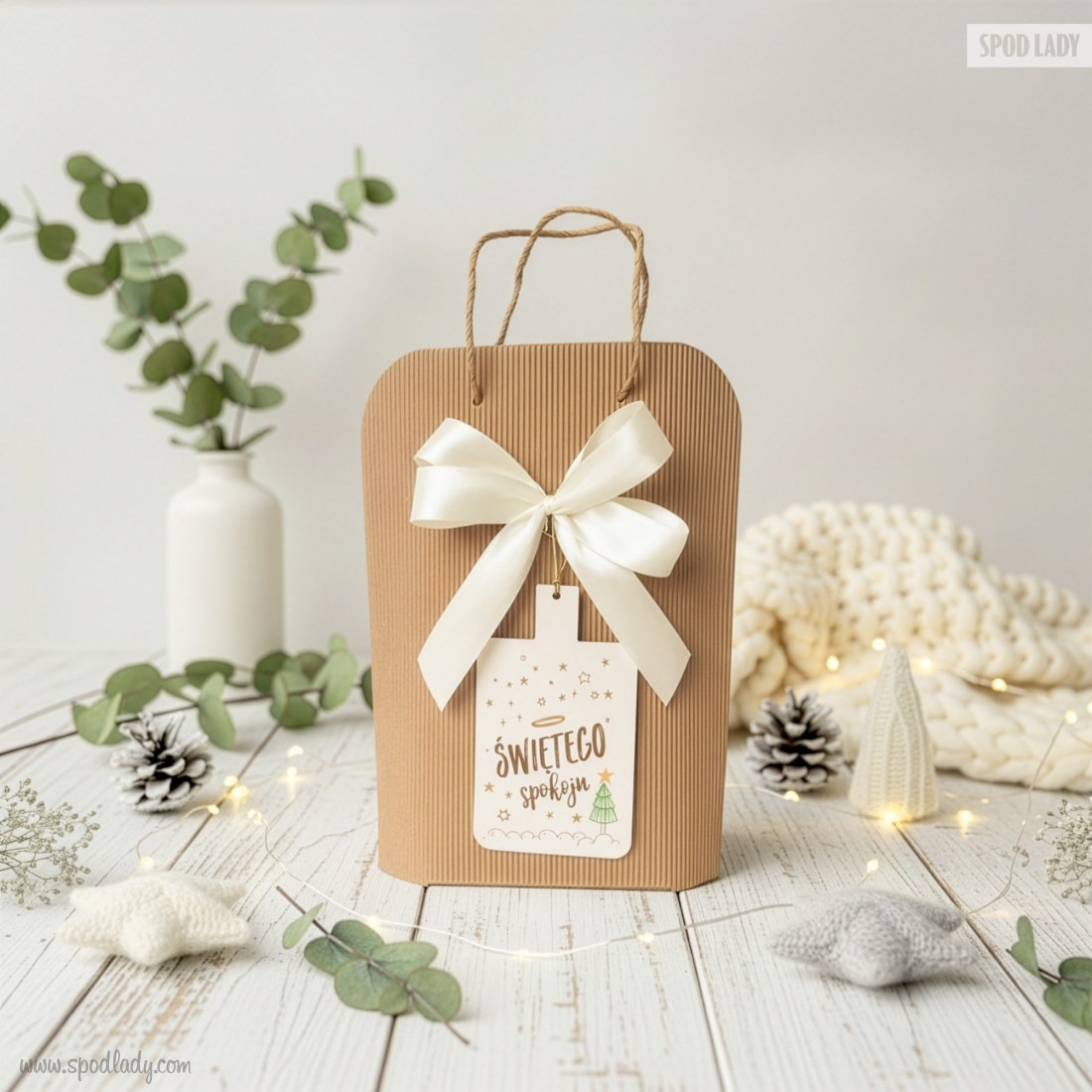 Oto słodki zestaw z piernikiem w torebce z tektury falistej z zawieszką "Świętego Spokoju". Elegancka oprawa, która zamieni twój upominek w świąteczny skarb gotowy do wręczenia. Łączy tradycję piernikarską ze świątecznym przesłaniem.