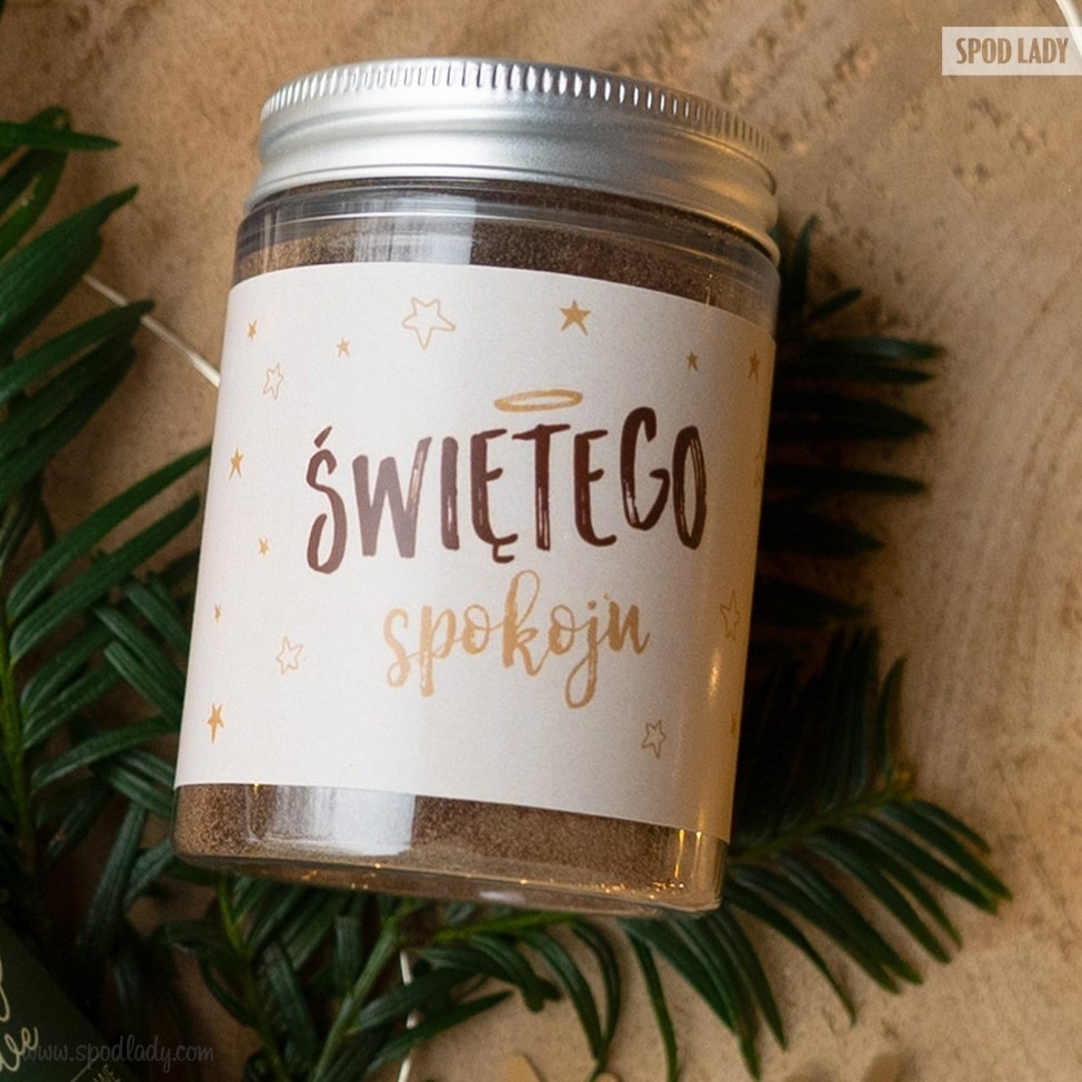 • Kawa w plastikowym słoiczku: znakomity smak kawy z nutą tiramisu lub korzennymi przyprawami. Słoiczek ozdobiliśmy naklejką z zawadiackim hasłem "Świętego Spokoju".