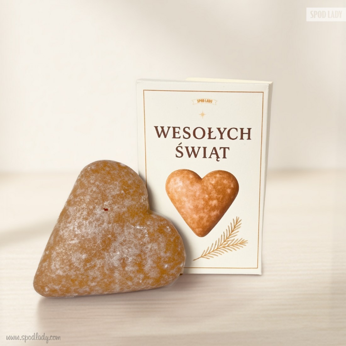 • Lukrowane serce piernikowe z Torunia: autentyczny toruński pierniczek schowany w owijce w kolorze ecru z życzeniami "Wesołych Świąt"