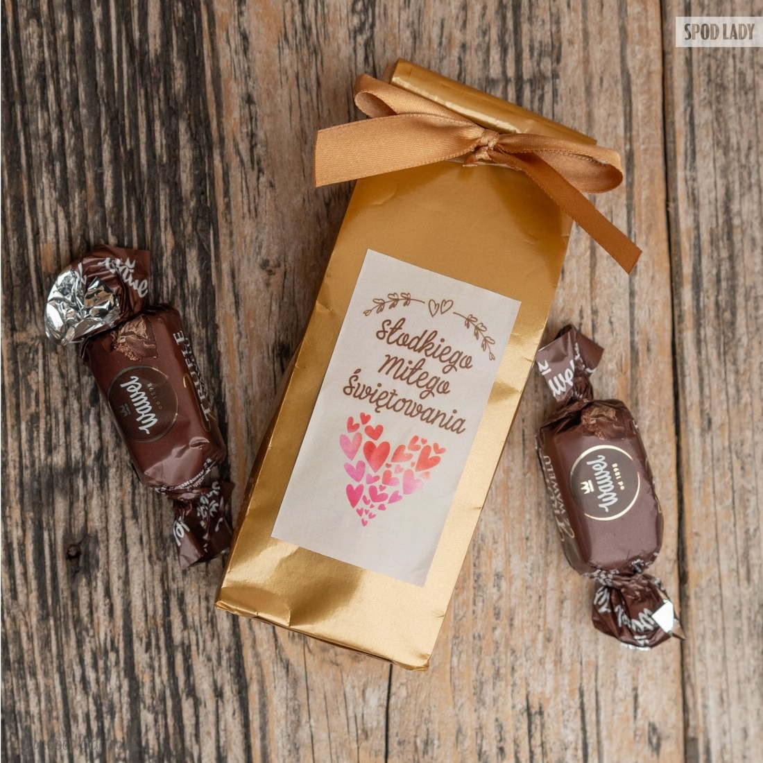 • Złota torebka ze słodkościami: oto torebka, która skrywa trufle i słodkie cukierki Konafetto — mały, uroczy dodatek, który dopełnia cały zestaw życzeniami "Słodkiego Miłego Świętowania".