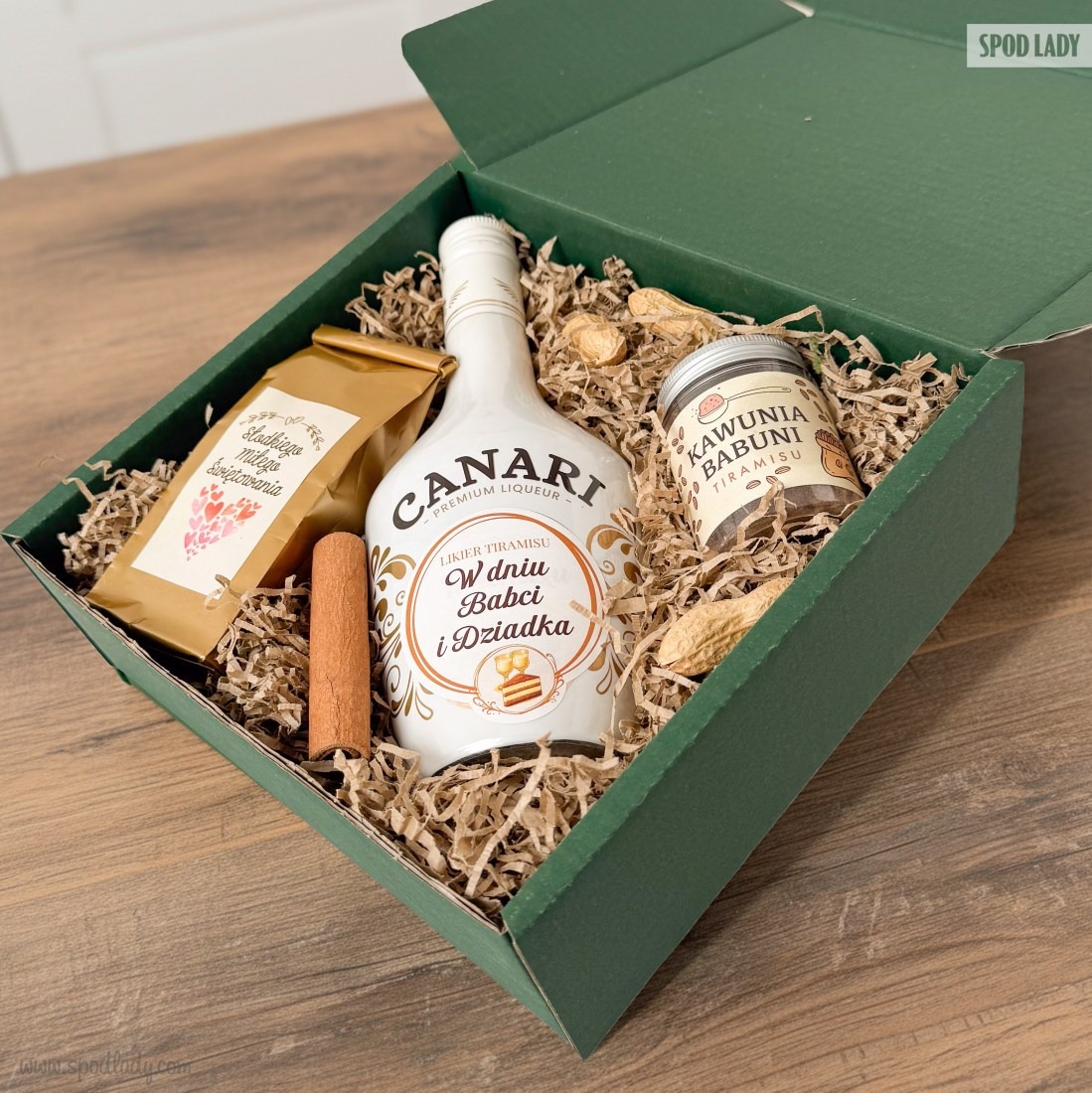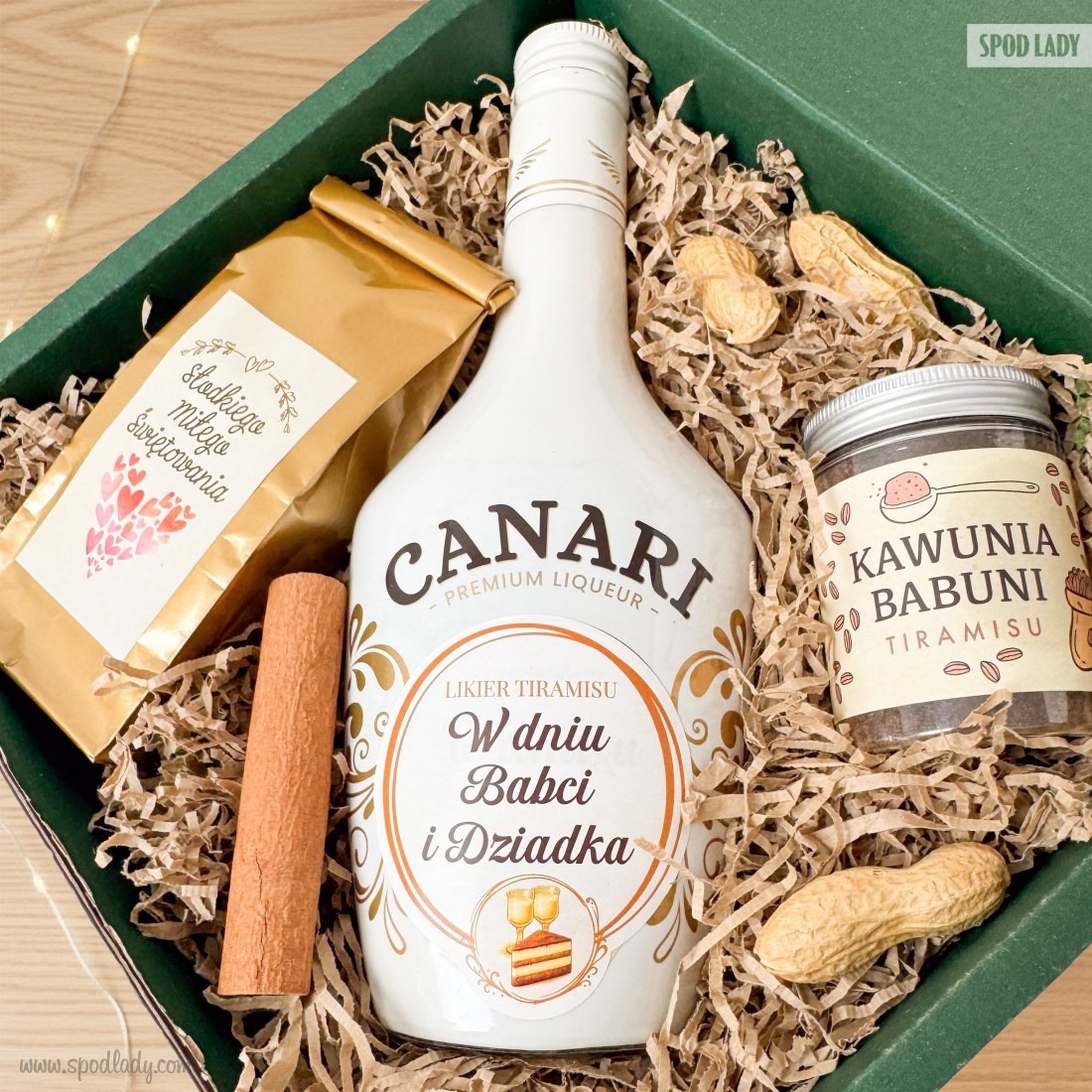 • Likier Canari Tiramisu z dedykacją: słodki i kremowy likier o smaku tiramisu w butelce z okolicznościową etykietą "W dniu Babci i Dziadka". To smaczny akcent, który podkreśla uroczysty charakter spotkania.