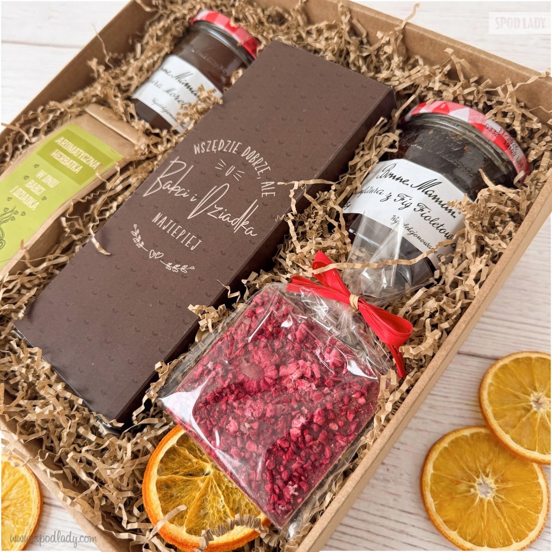 Ten przyjazny zestaw to trafiony wybór dla Dziadków ceniących osobiste gesty i smaczne tradycje. Produkty spoczywają w kartoniku z kraftowym siankiem i plastrem pomarańczy, co tworzy stylowy i ciepły widok. To upominek, który podkreśla naturalny charakter prezentu. Będzie serdecznym gestem z okazji Dnia Babci i Dziadka.