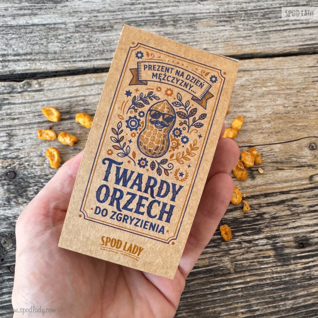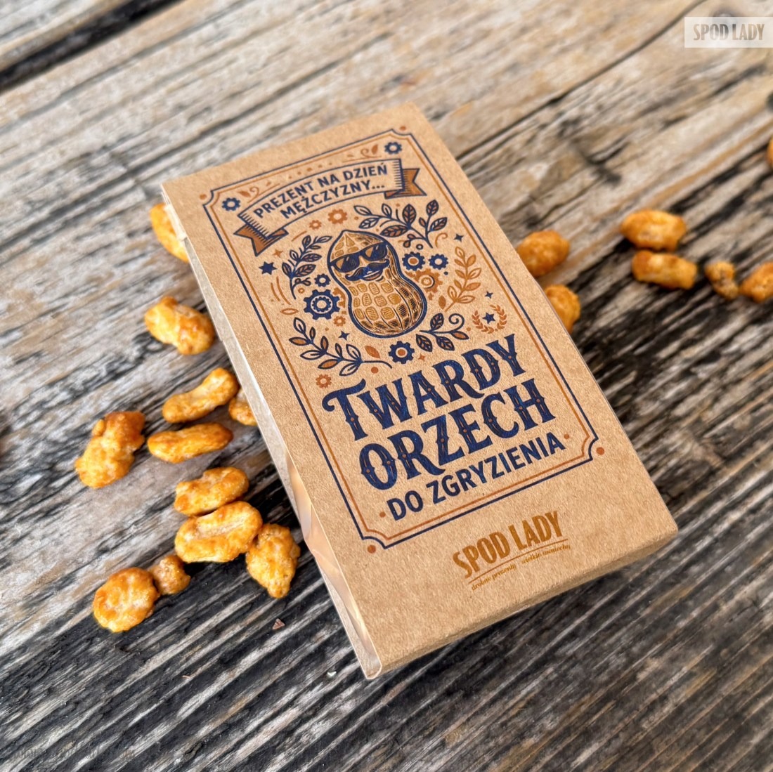 Znaleźć prezent na Dzień Mężczyzny bywa… twardym orzechem do zgryzienia. Dlatego ten upominek jest celowo mały i konkretny: chrupiące orzeszki w karmelu w matowej torebce, owinięte kraftową owijką z autorską grafiką. Najlepiej działa jako dodatek do butelki kraftowego piwa.
