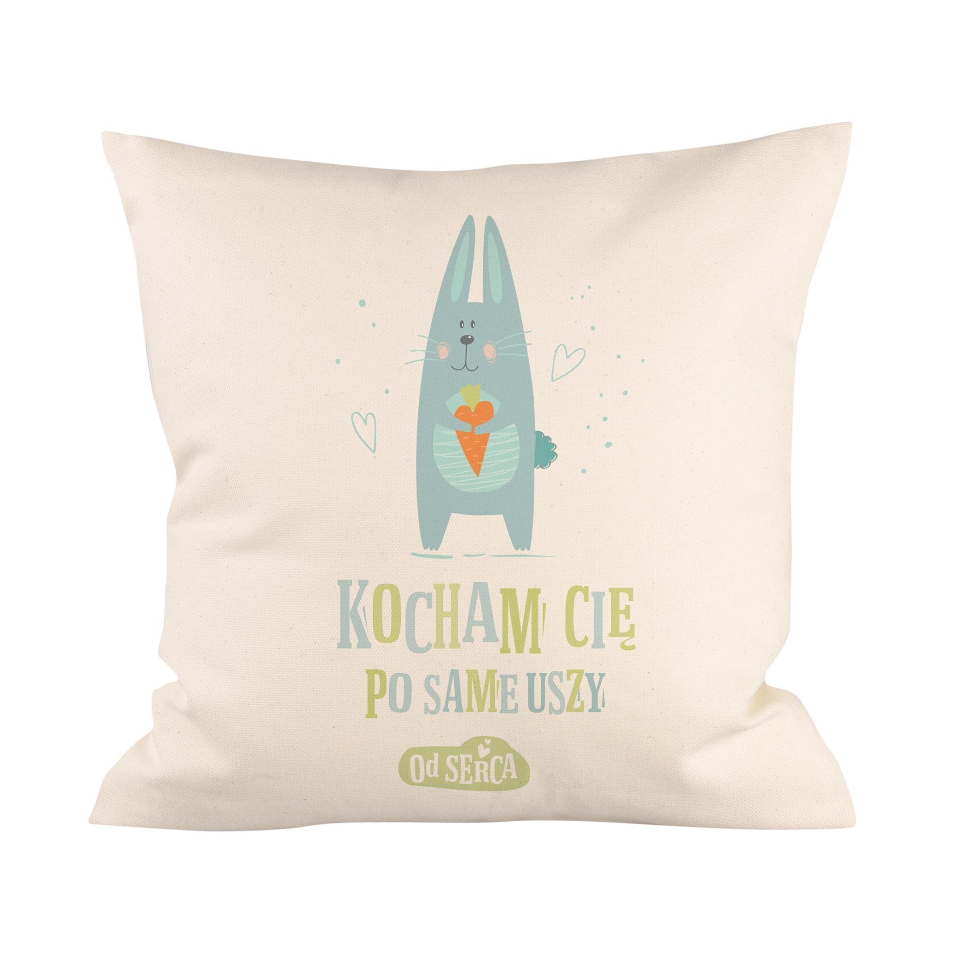 Podusia z napisem "Kocham po uszy" i wizerunkiem uroczego zajączka